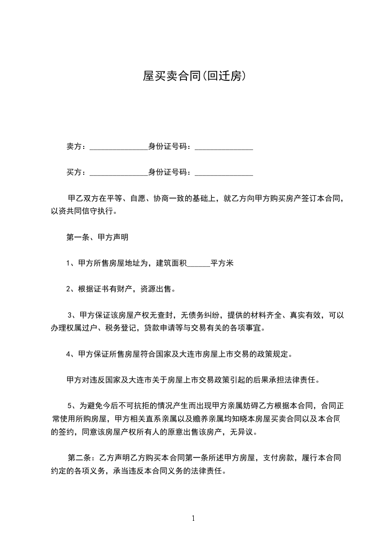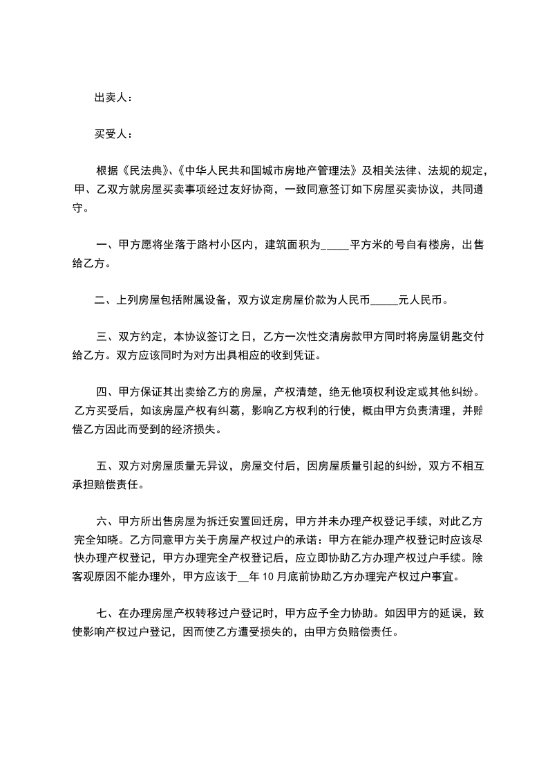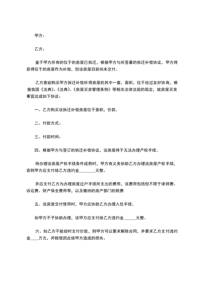 甲方在__________小区有一套回迁楼(包括楼上阁楼、___________平仓房),具体房屋编号为:_______________,面积为___________平方米,门牌号___________,仓房号由___________介绍,乙方同意购买甲方回迁楼(包括),经甲乙双方充分协商本着自愿的原则达成以下协议,具体内容如下:
