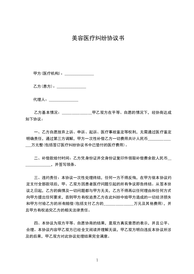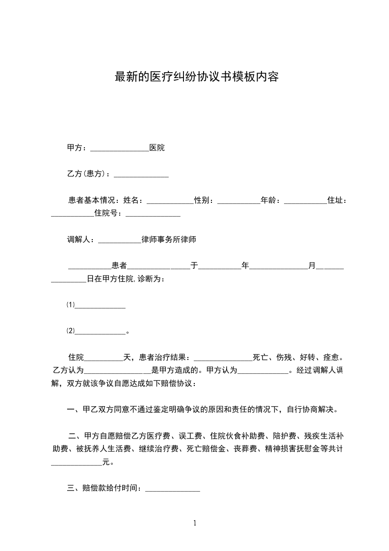 住院__________天,患者治疗结果:_______________死亡、伤残、好转、痊愈。乙方认为_________________是甲方造成的。甲方认为_____________。经过调解人调解,双方就该争议自愿达成如下赔偿协议:
