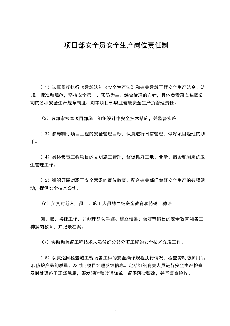 (1)认真贯彻执行《建筑法》、《安全生产法》和有关建筑工程安全生产法令、法规、标准和规范,坚持安全第一、预防为主、综合治理的方针,具体负责落实集团公司的各项安全生产规章制度,对本项目部职业健康安全生产负管理责任。