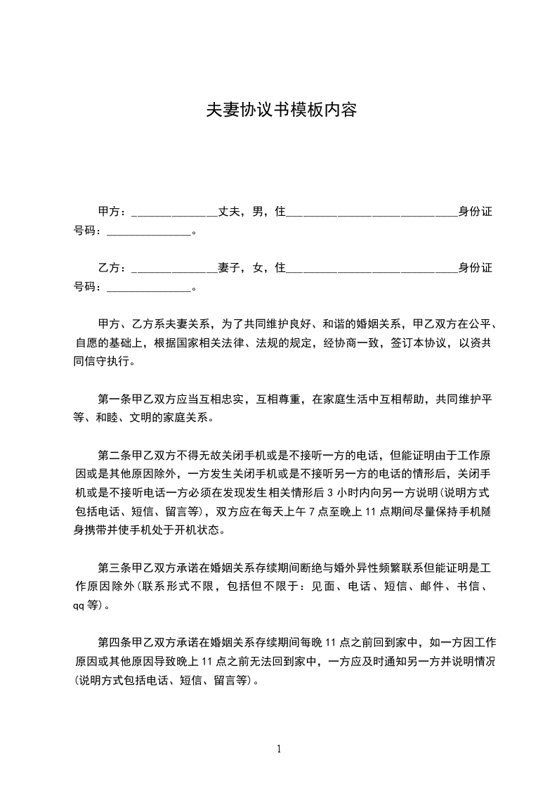 第四条甲乙双方承诺在婚姻关系存续期间每晚11点之前回到家中,如一方因工作原因或其他原因导致晚上11点之前无法回到家中,一方应及时通知另一方并说明情况(说明方式包括电话、短信、留言等)。