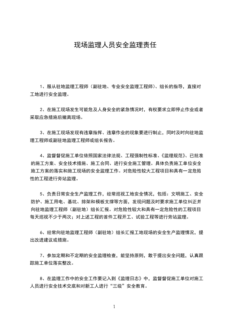1、服从驻地监理工程师(副驻地、专业安全监理工程师)、组长的指导,直接对工地进行安全监理。