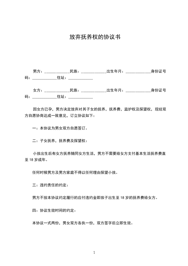 因女方已孕,男方决定放弃对其子女的抚养,抚养费,监护权及探望权,现经双方自愿协商达成一致意见,订立协议如下: