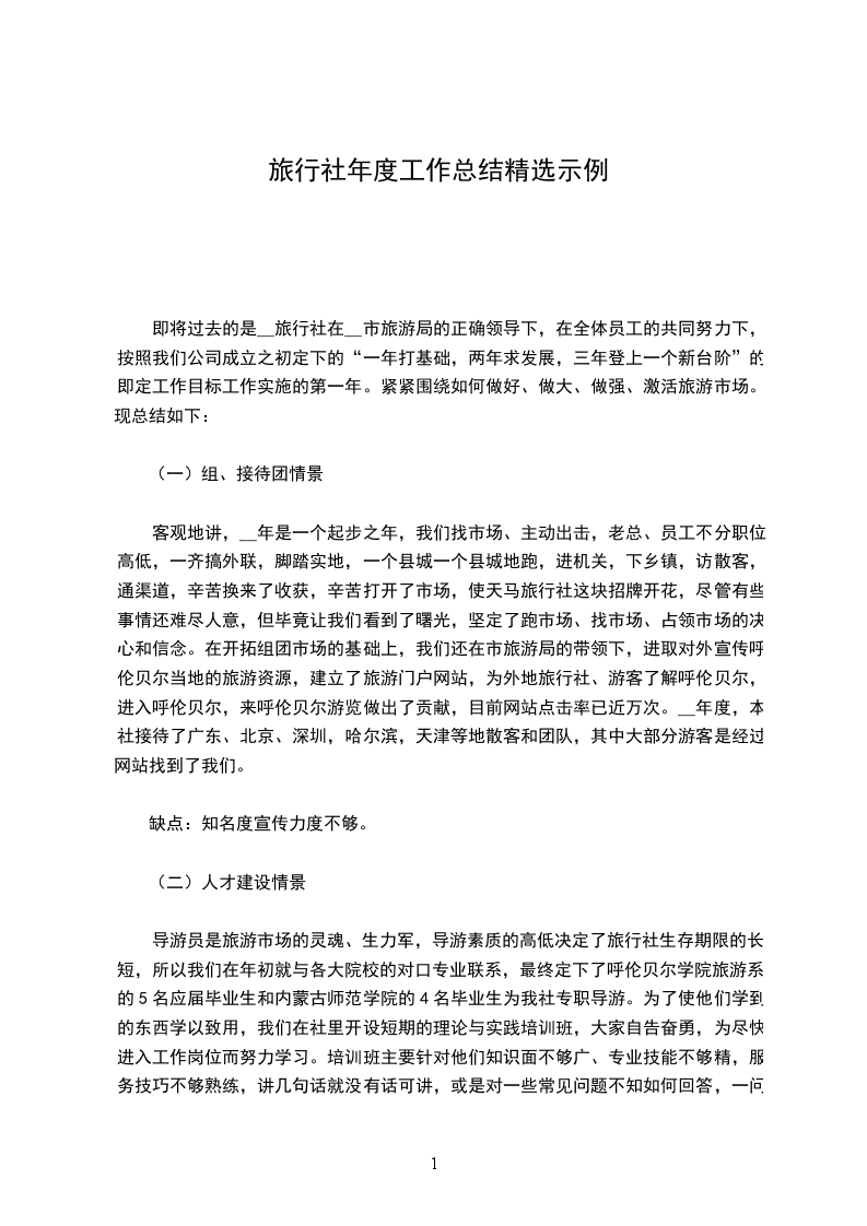 即将过去的是__旅行社在__市旅游局的正确领导下,在全体员工的共同努力下,按照我们公司成立之初定下的“一年打基础,两年求发展,三年登上一个新台阶”的即定工作目标工作实施的第一年。紧紧围绕如何做好、做大、做强、激活旅游市场。现总结如下: