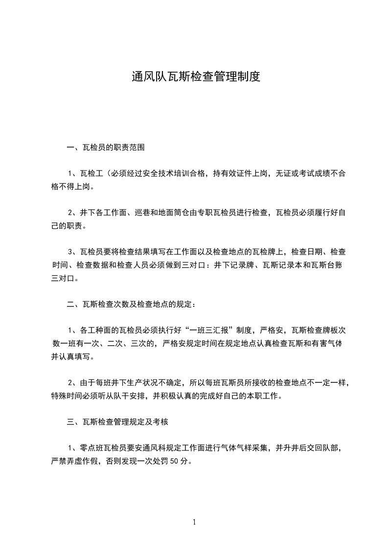 1、零点班瓦检员要安通风科规定工作面进行气体气样采集,并升井后交回队部,严禁弄虚作假,否则发现一次处罚50分。