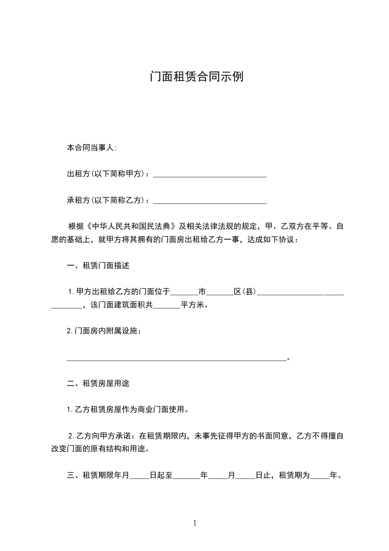 根据《中华人民共和国民法典》及相关法律法规的规定,甲、乙双方在平等、自愿的基础上,就甲方将其拥有的门面房出租给乙方一事,达成如下协议: