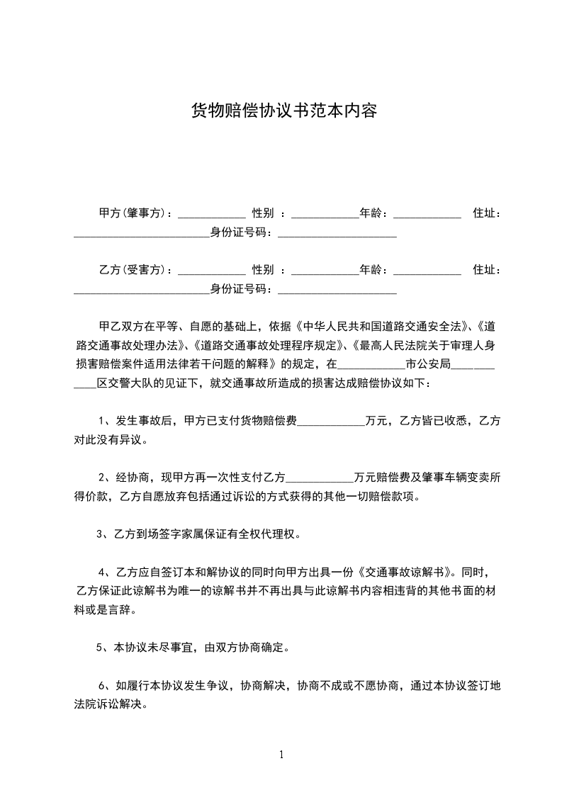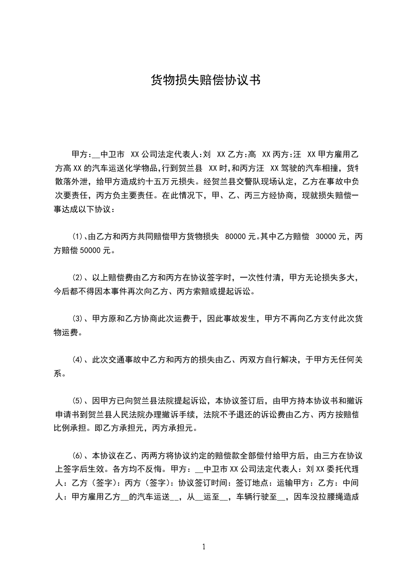 1、乙方自愿赔偿甲方货物损失费______人民币。