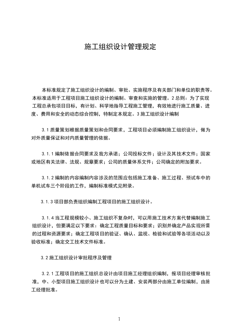 本标准规定了施工组织设计的编制、审批、实施程序及有关部门和单位的职责等。本标准适用于工程项目施工组织设计的编制、审查和实施的管理。2总则:为了实现工程总承包项目目标,有计划、科学地指导工程施工管理,有效地进行施工质量、进度、费用和安全的动态综合控制,特制定本规定。3施工组织设计编制