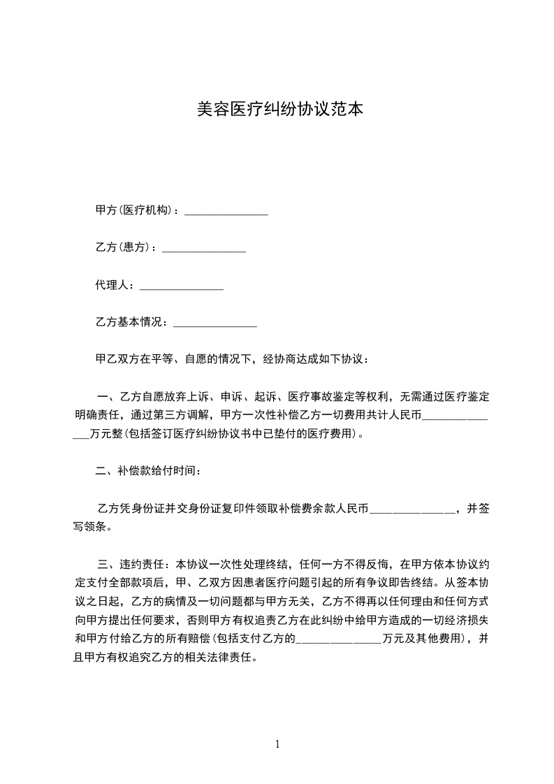 一、乙方自愿放弃上诉、申诉、起诉、医疗事故鉴定等权利,无需通过医疗鉴定明确责任,通过第三方调解,甲方一次性补偿乙方一切费用共计人民币_______________万元整(包括签订医疗纠纷协议书中已垫付的医疗费用)。