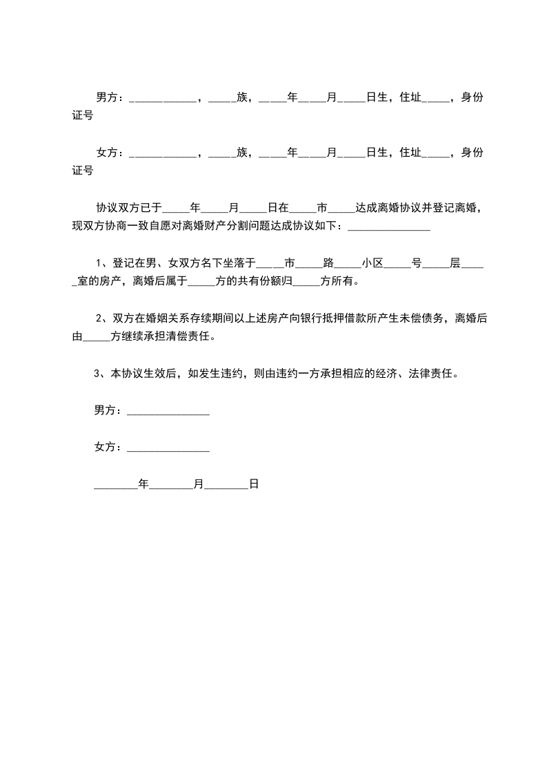 协议双方已于_____年_____月_____日在_____市_____达成离婚协议并登记离婚,现双方协商一致自愿对离婚财产分割问题达成协议如下:_______________