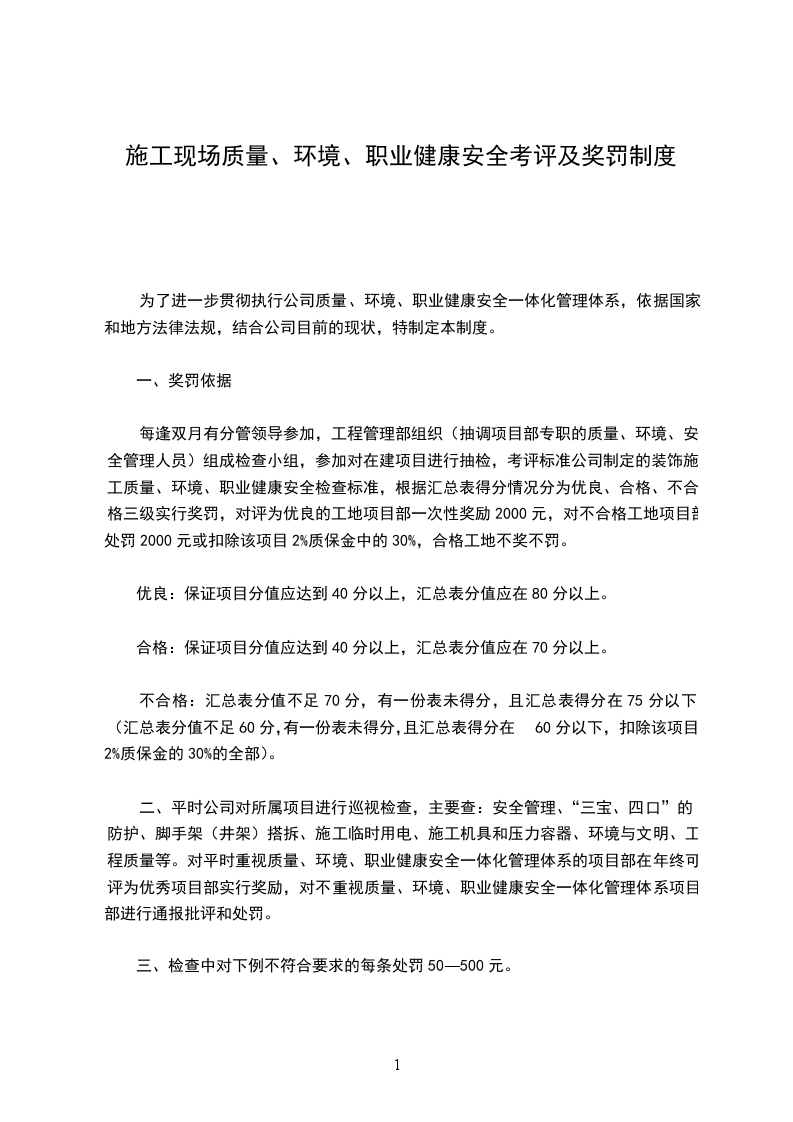 每逢双月有分管领导参加,工程管理部组织(抽调项目部专职的质量、环境、安全管理人员)组成检查小组,参加对在建项目进行抽检,考评标准公司制定的装饰施工质量、环境、职业健康安全检查标准,根据汇总表得分情况分为优良、合格、不合格三级实行奖罚,对评为优良的工地项目部一次性奖励2000元,对不合格工地项目部处罚2000元或扣除该项目2%质保金中的30%,合格工地不奖不罚。