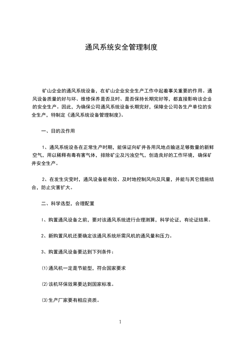 矿山企业的通风系统设备,在矿山企业安全生产工作中起着事关重要的作用。通风设备质量的好与坏、维修保养是否及时、是否保持长期完好等,都直接影响该企业的安全生产。因此,为确保公司通风系统设备长期完好,保障全公司各生产单位的安全生产,特制定《通风系统设备管理制度》。