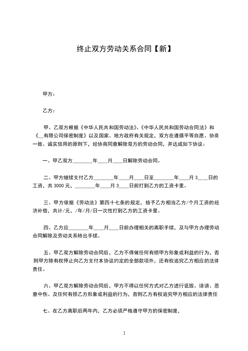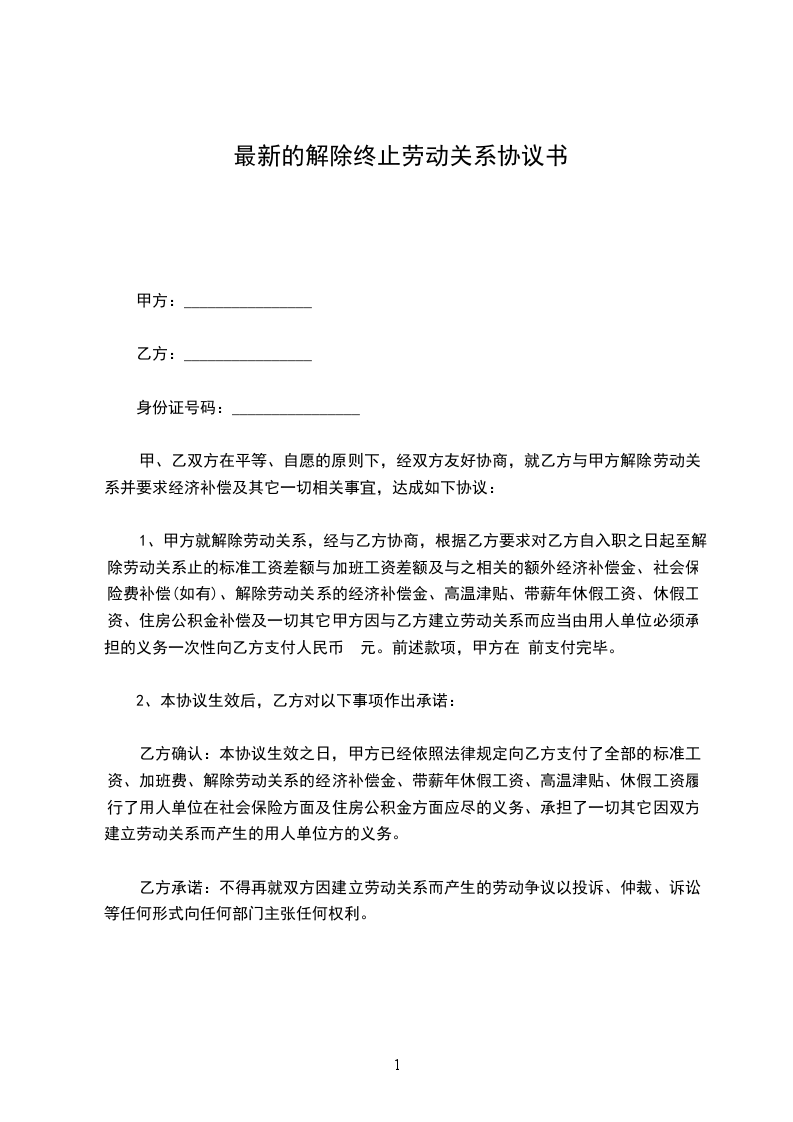 1、自_____________年__________月__________日起,解除双方签订的劳动合同,双方的权利义务随之终止;