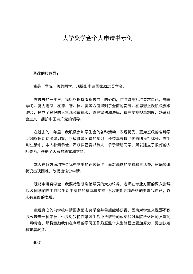 我现真心的向学校申请国家励志奖学金并希望能够获得,因为对学生来说那不仅是代表着一种荣誉,也是对我们在学习生活中所取得的成绩和对学院所做出的贡献的一种肯定,那将激励我们在今后的学习工作乃至整个人生路程上更加努力,更加执着和充满激情。