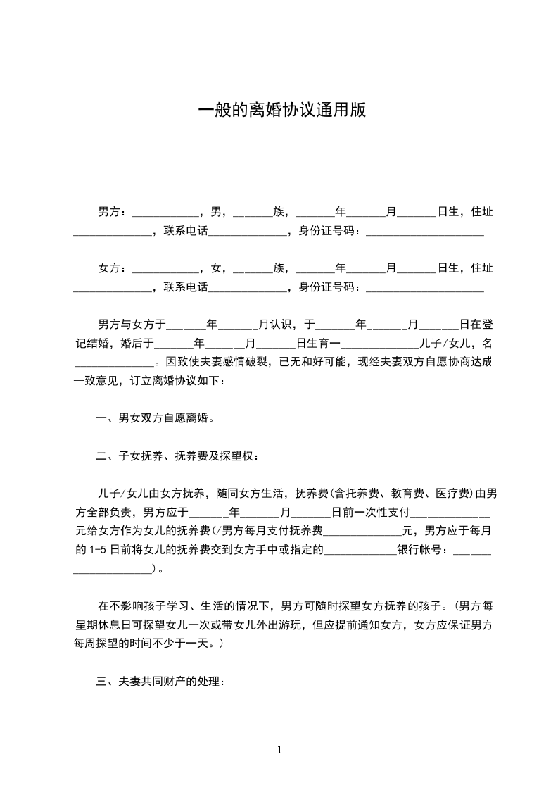 1、甲方同意座落于____________________房屋一套归乙方所有,以及甲乙双方婚姻存续期间的其它全部财产归乙方所有。