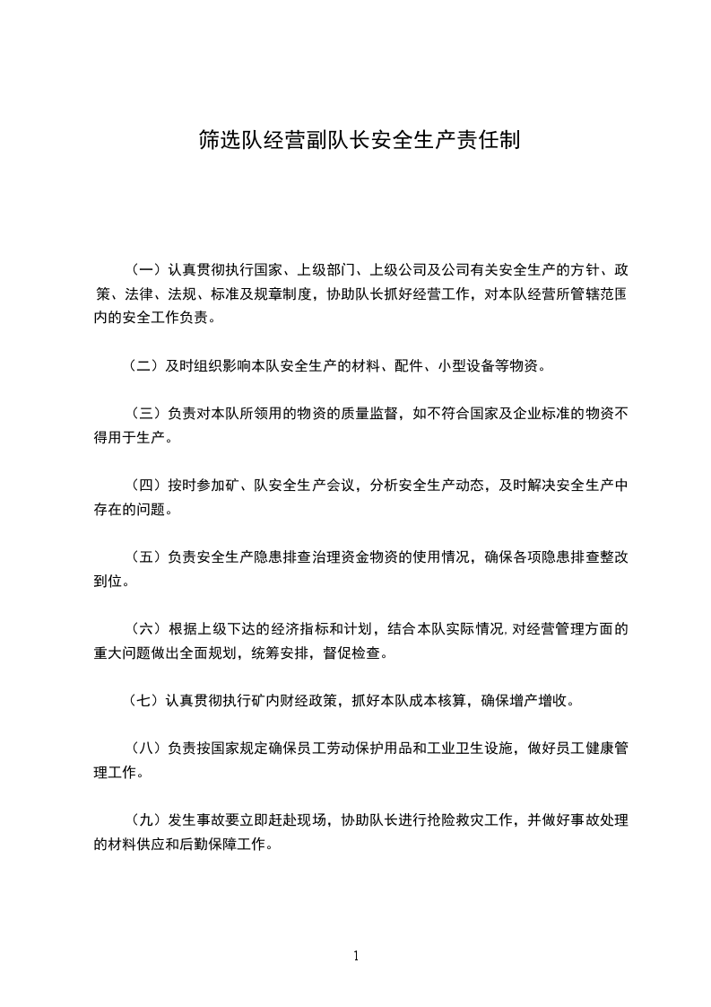 (一)认真贯彻执行国家、上级部门、上级公司及公司有关安全生产的方针、政策、法律、法规、标准及规章制度,协助队长抓好经营工作,对本队经营所管辖范围内的安全工作负责。