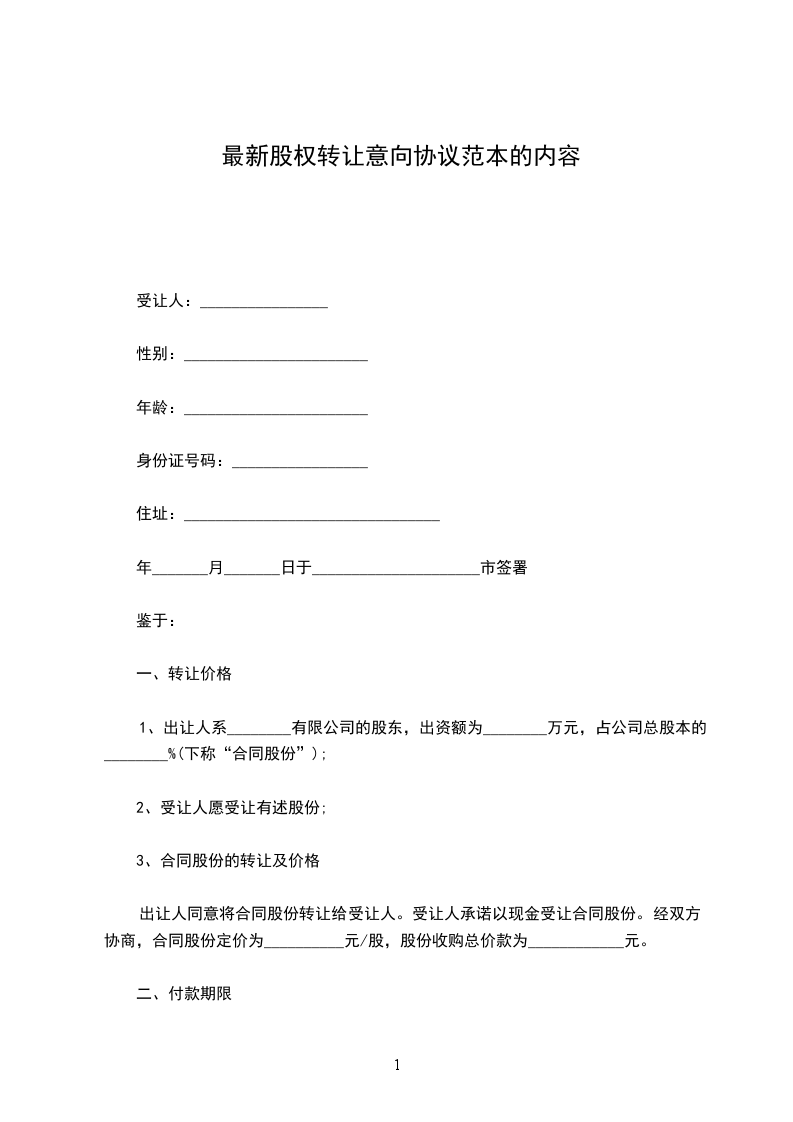1、出让人系________有限公司的股东,出资额为________万元,占公司总股本的________%(下称“合同股份”);