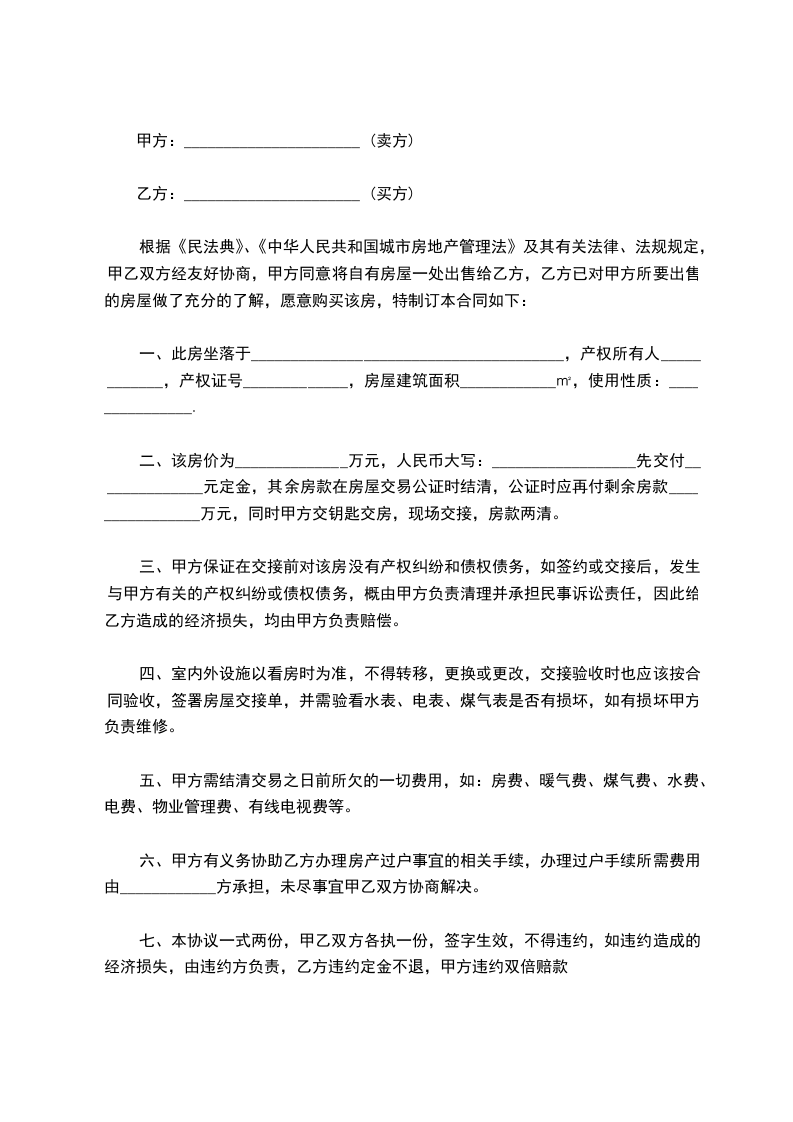 根据《民法典》、《中华人民共和国城市房地产管理法》及其有关法律、法规规定,甲乙双方经友好协商,甲方同意将自有房屋一处出售给乙方,乙方已对甲方所要出售的房屋做了充分的了解,愿意购买该房,特制订本合同如下: