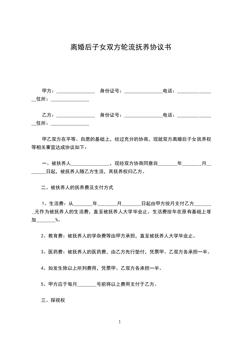 1、生活费:从________年________月________日起由甲方按月支付乙方________元作为被抚养人的生活费,直至被抚养人大学毕业止。生活费按年在原有基础上增加________%。