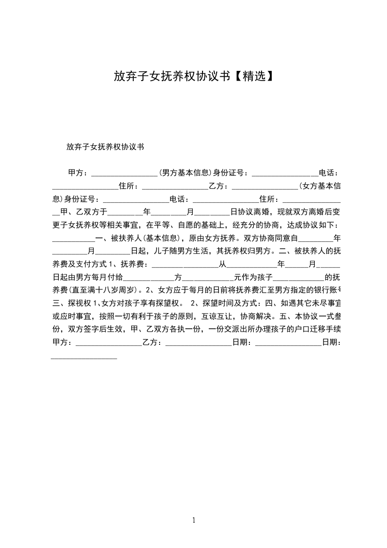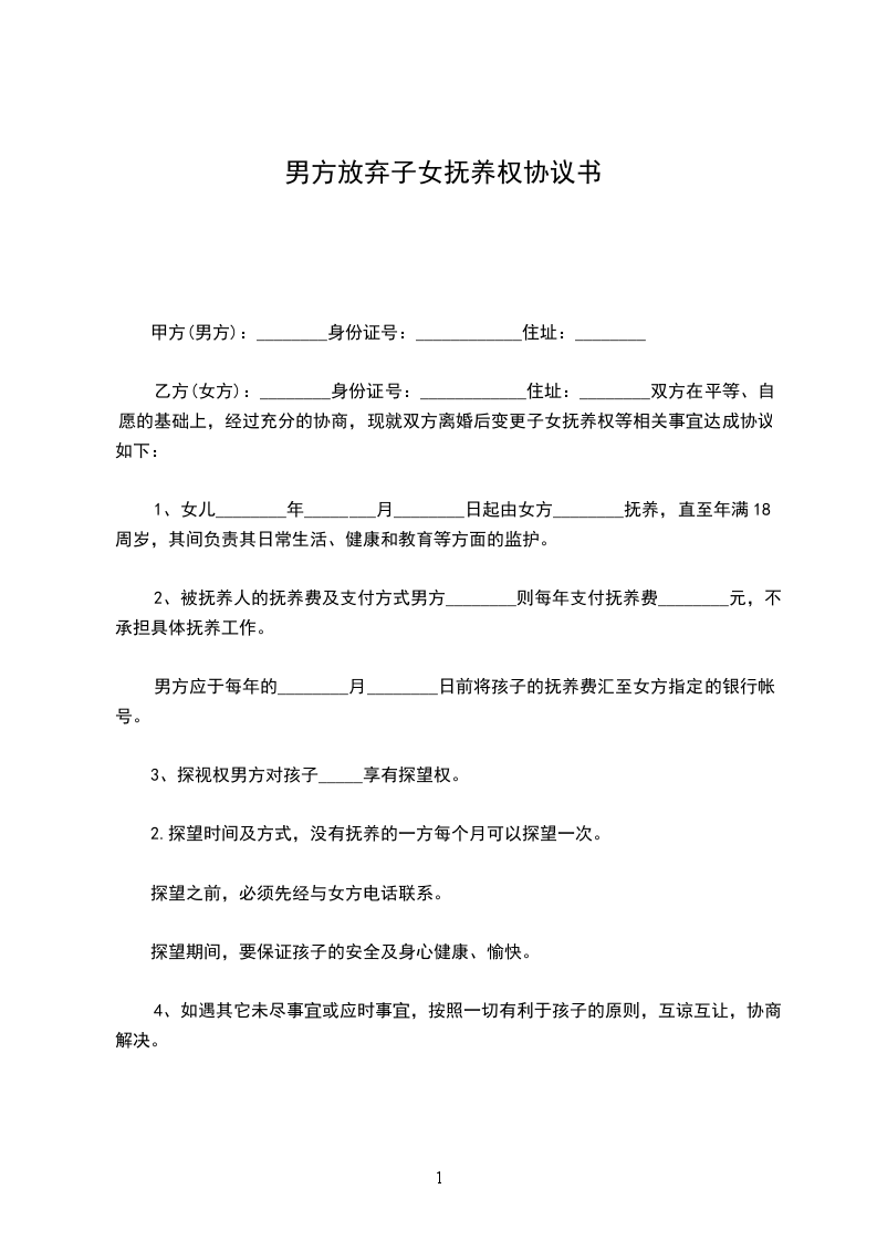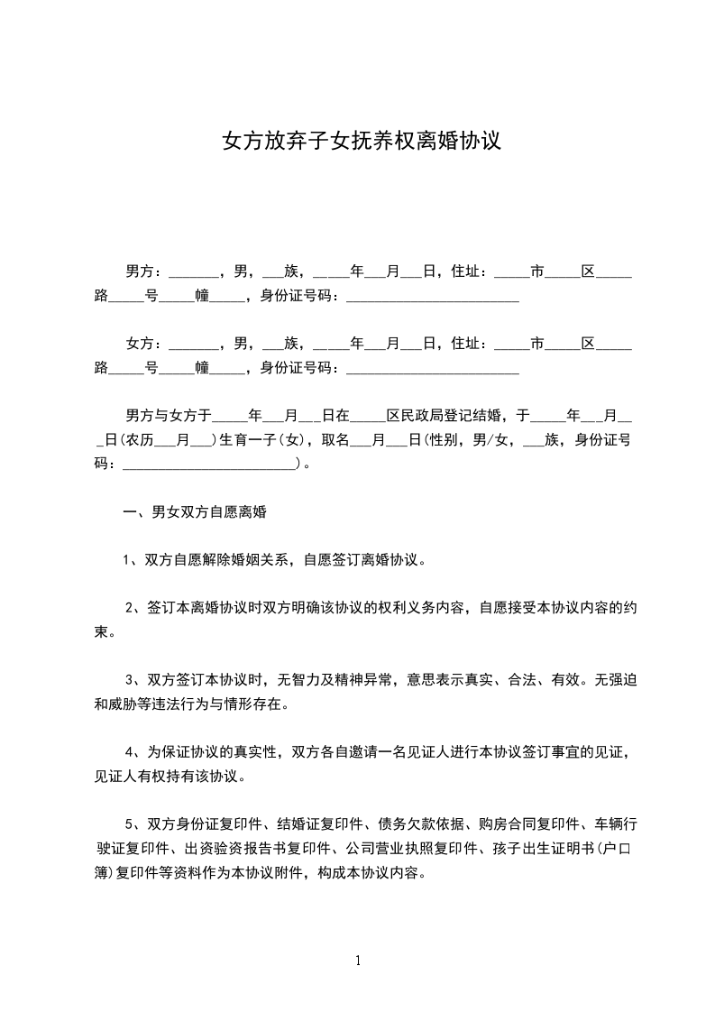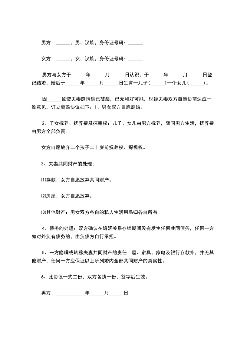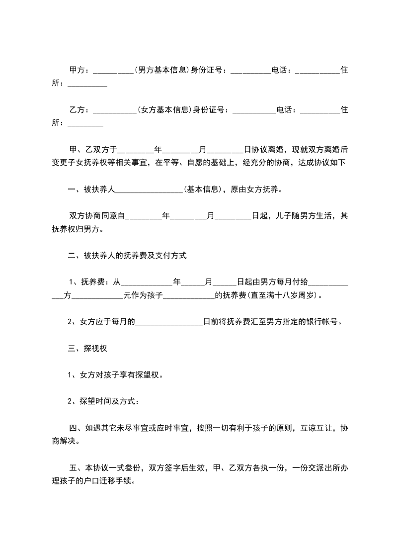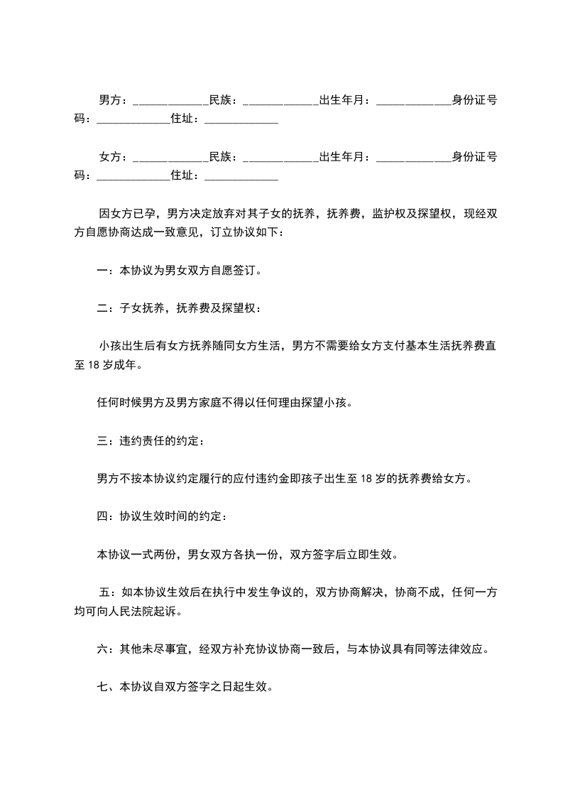协议人:乙方,____________(女方)出生______年______月______日 身份证号码____________ 家庭住址 ____________联系电话____________