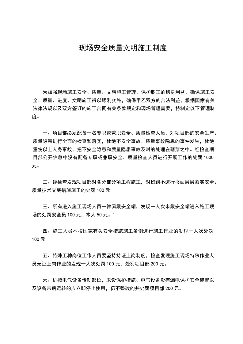 一、施工人员必须服从项目部的管理,对不服从项目部人员管理者第一次下整改通知单,第二次对当事人罚款100元,再次加倍。与项目人员吵架,罚款100元,再次清除场地。