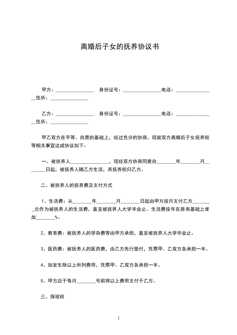 1、生活费:从________年________月________日起由甲方按月支付乙方________元作为被抚养人的生活费,直至被抚养人大学毕业止。生活费按年在原有基础上增加________%。