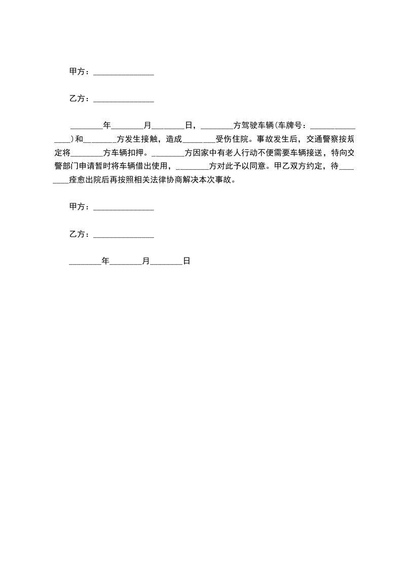 ________年________月________日,________方驾驶车辆(车牌号:_______________)和________方发生接触,造成________受伤住院。事故发生后,交通警察按规定将________方车辆扣押。________方因家中有老人行动不便需要车辆接送,特向交警部门申请暂时将车辆借出使用,________方对此予以同意。甲乙双方约定,待________痊愈出院后再按照相关法律协商解决本次事故。