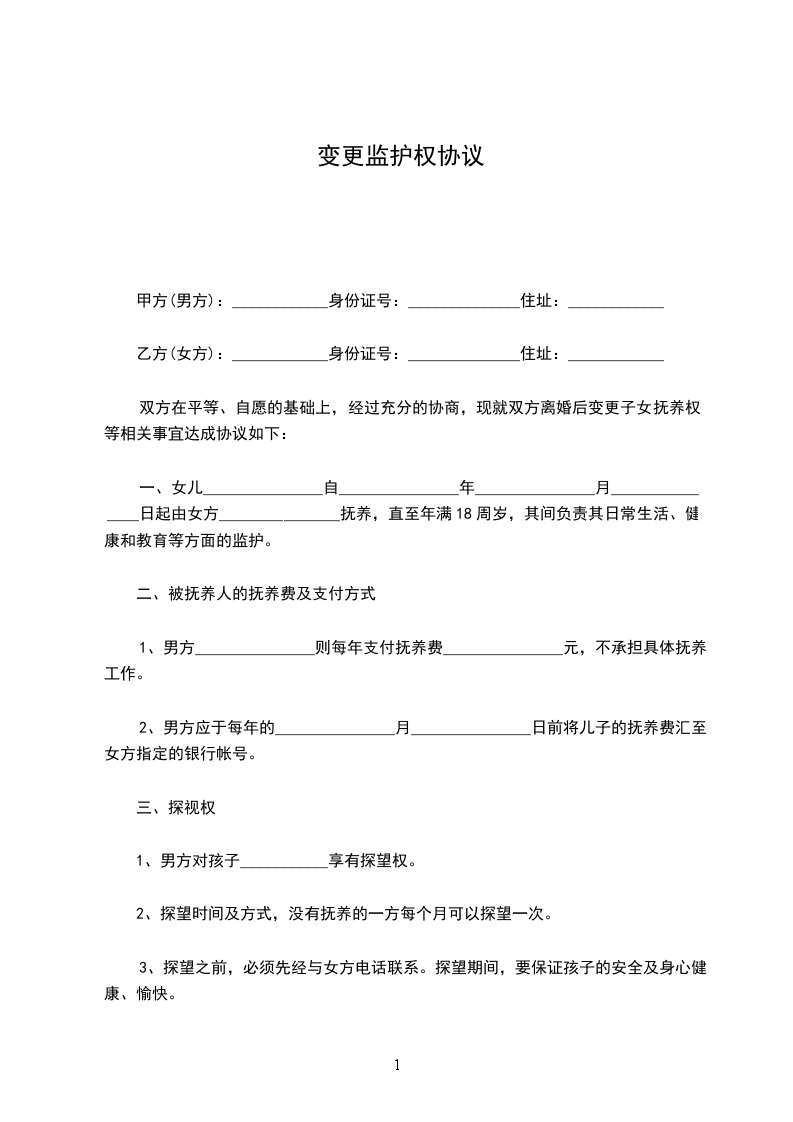 双方在平等、自愿的基础上,经过充分的协商,现就双方离婚后变更子女抚养权等相关事宜达成协议如下: