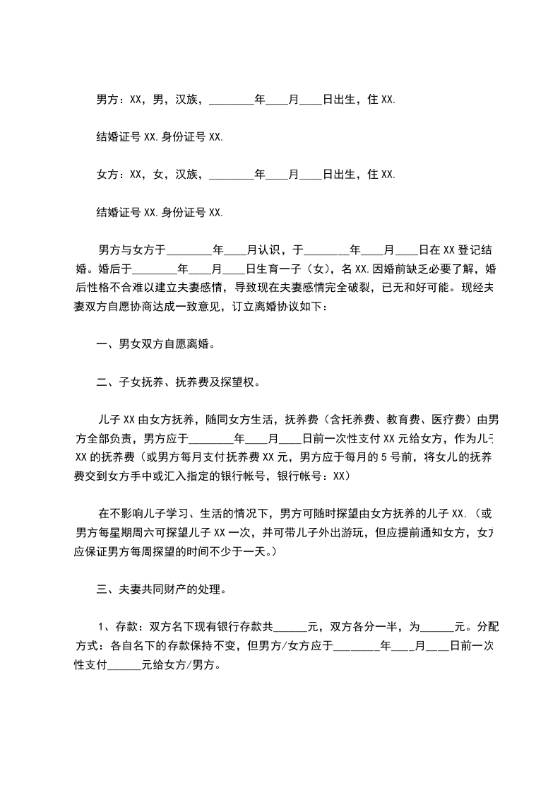 男方与女方于________年____月认识,于________年____月____日在XX登记结婚。婚后于________年____月____日生育一子(女),名XX.因婚前缺乏必要了解,婚后性格不合难以建立夫妻感情,导致现在夫妻感情完全破裂,已无和好可能。现经夫妻双方自愿协商达成一致意见,订立离婚协议如下: