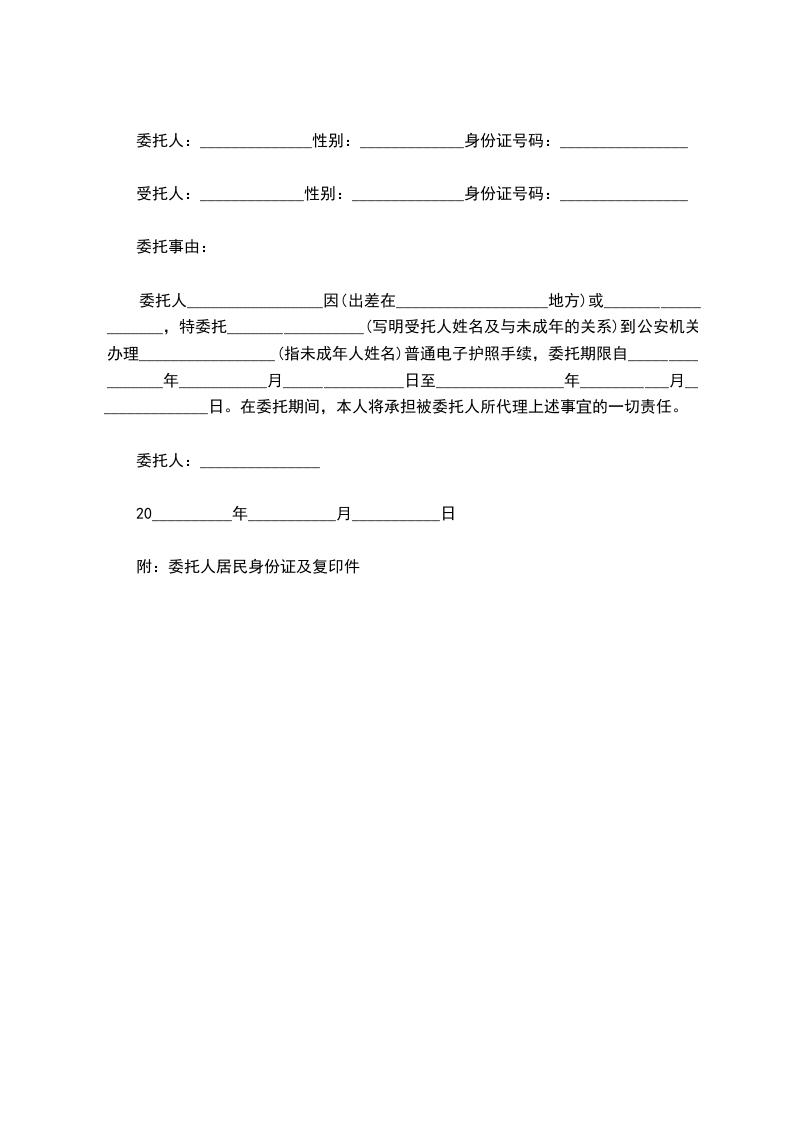 委托人_________________因(出差在___________________地方)或___________________,特委托_________________(写明受托人姓名及与未成年的关系)到公安机关办理_________________(指未成年人姓名)普通电子护照手续,委托期限自________________年___________月_______________日至________________年___________月_______________日。在委托期间,本人将承担被委托人所代理上述事宜的一切责任。