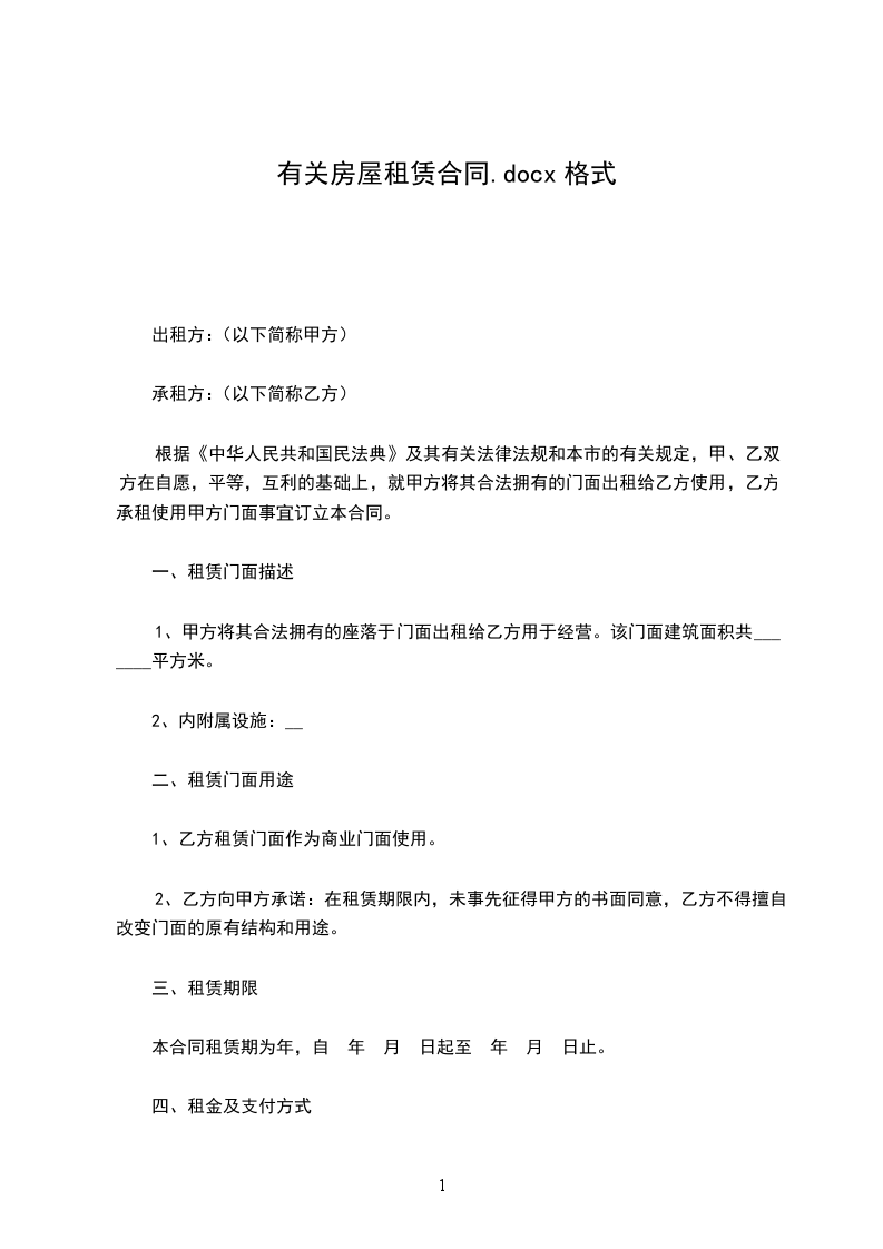 1、甲方将其合法拥有的座落于门面出租给乙方用于经营。该门面建筑面积共_______平方米。