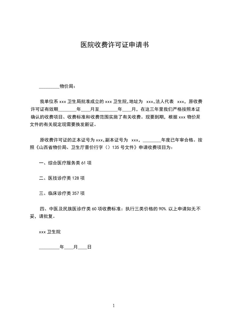 原收费许可证的正本证号为xxx,副本证号为xxx,________年度已年审合格。按照《山西省物价局、卫生厅晋价行字()135号文件》申请收费项目为: