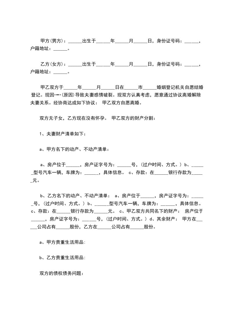 b、乙方名下的动产、不动产清单: a、房产位于______,房产证字号为:______号,(过户时间、方式。) b、______型号汽车一辆,车牌为:______,具体信息。 c、存款:在______银行存款为______元。 c、甲乙双方共同名下的财产: 房产位于______,房产证字号为:______号,(过户时间、方式。) d、其余财产: 甲方在______公司占有______股份,乙方在______公司占有______股份。
