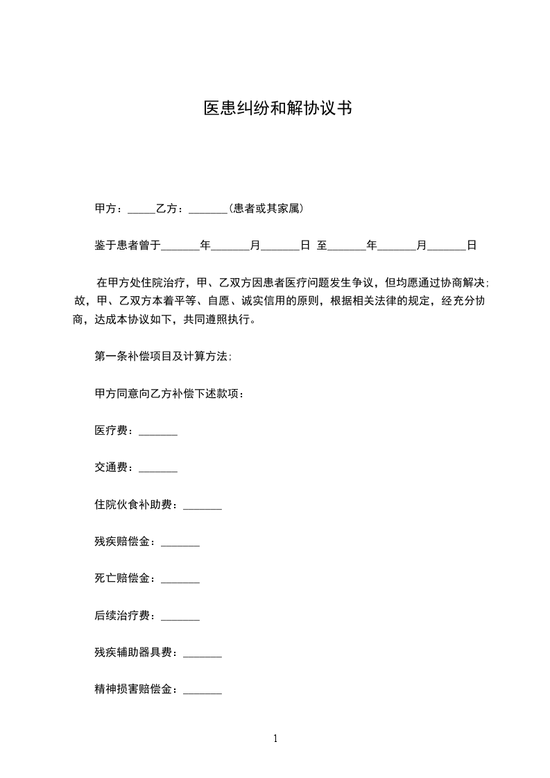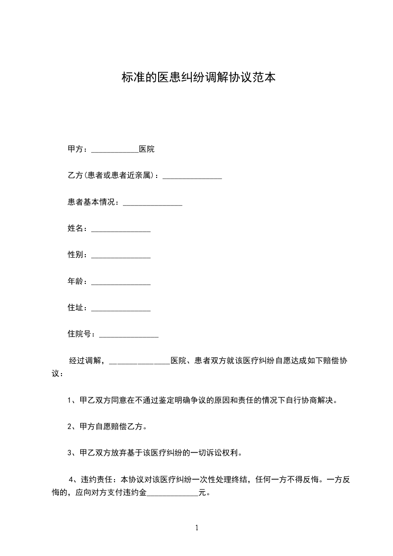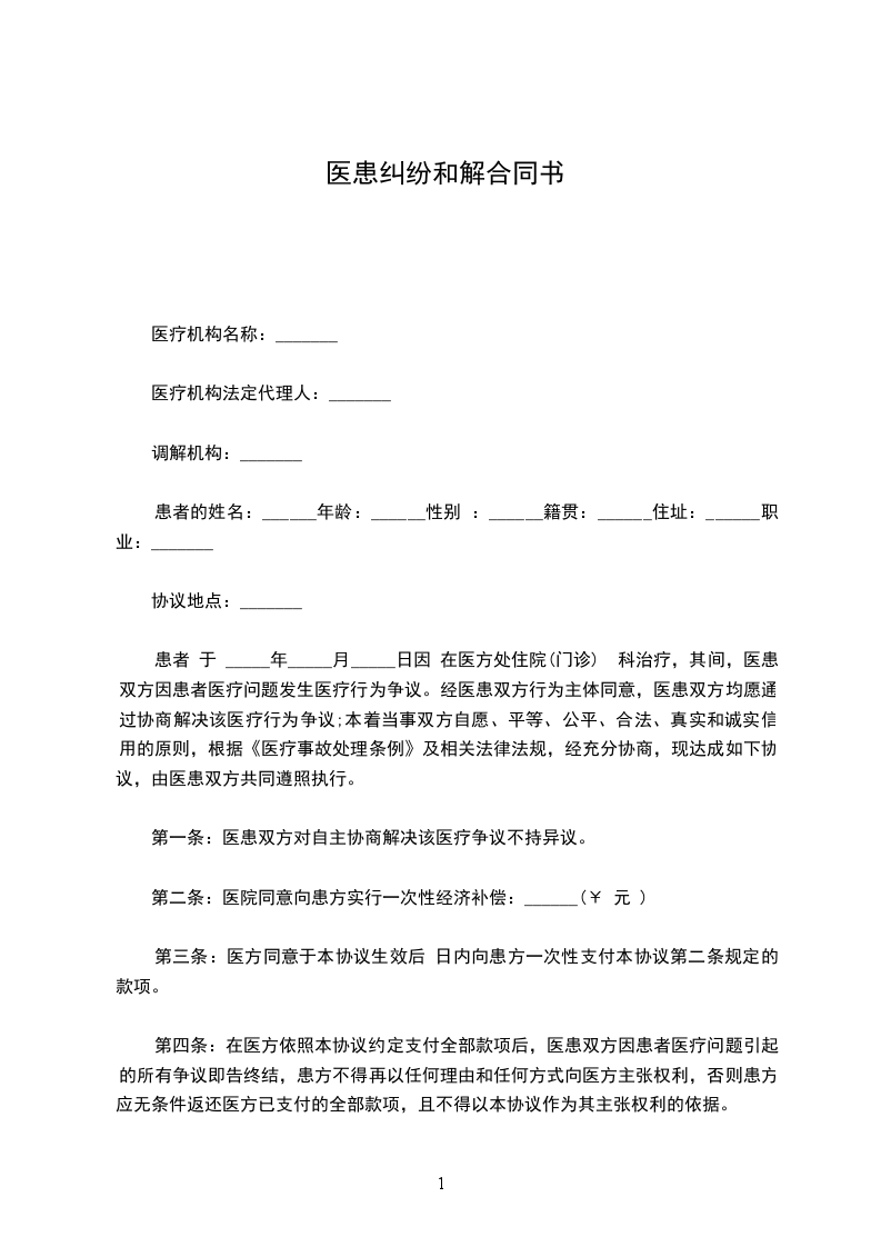 4、违约责任:本协议对该医疗纠纷一次性处理终结,任何一方不得反悔。一方反悔的,应向对方支付违约金_____________元。