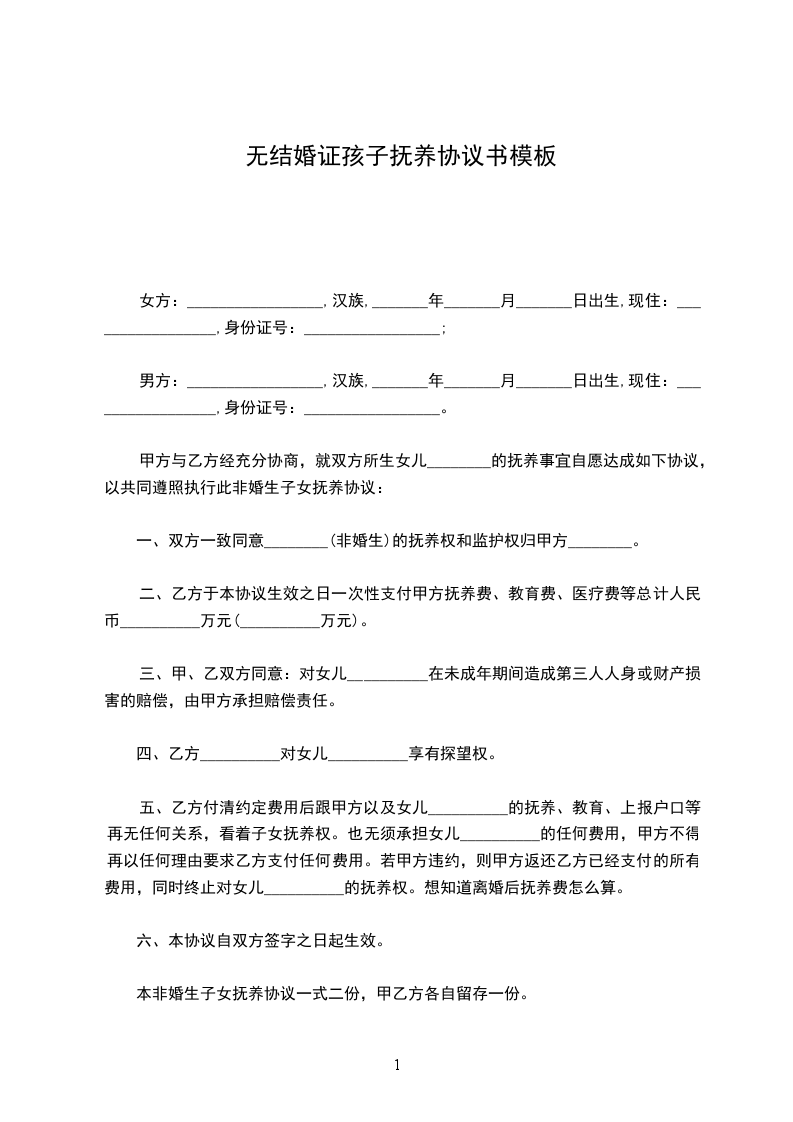 甲方与乙方经充分协商,就双方所生女儿________的抚养事宜自愿达成如下协议,以共同遵照执行此非婚生子女抚养协议: