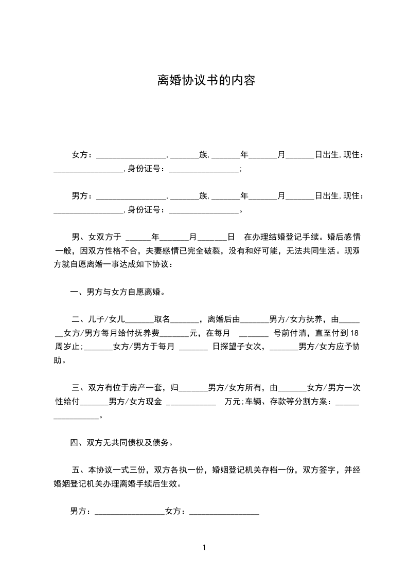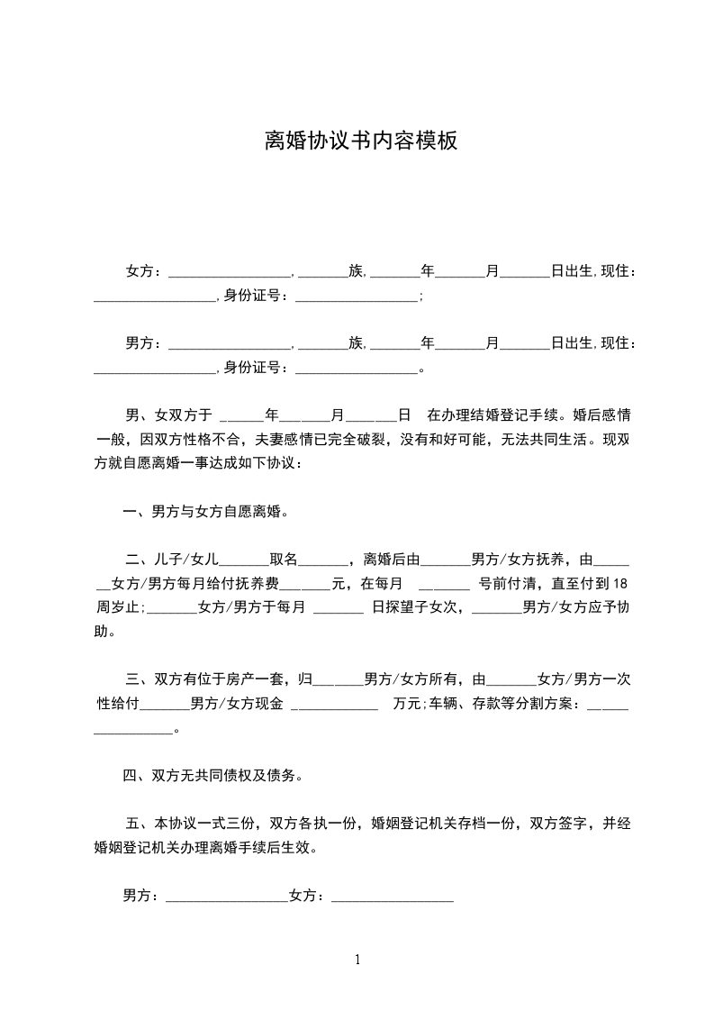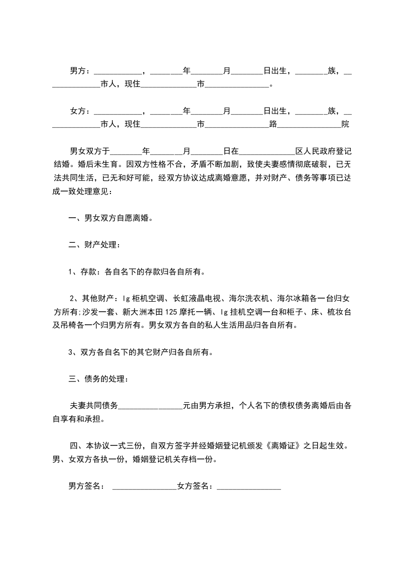 男、女双方于 ______年_______月_______日 在办理结婚登记手续。婚后感情一般,因双方性格不合,夫妻感情已完全破裂,没有和好可能,无法共同生活。现双方就自愿离婚一事达成如下协议:
