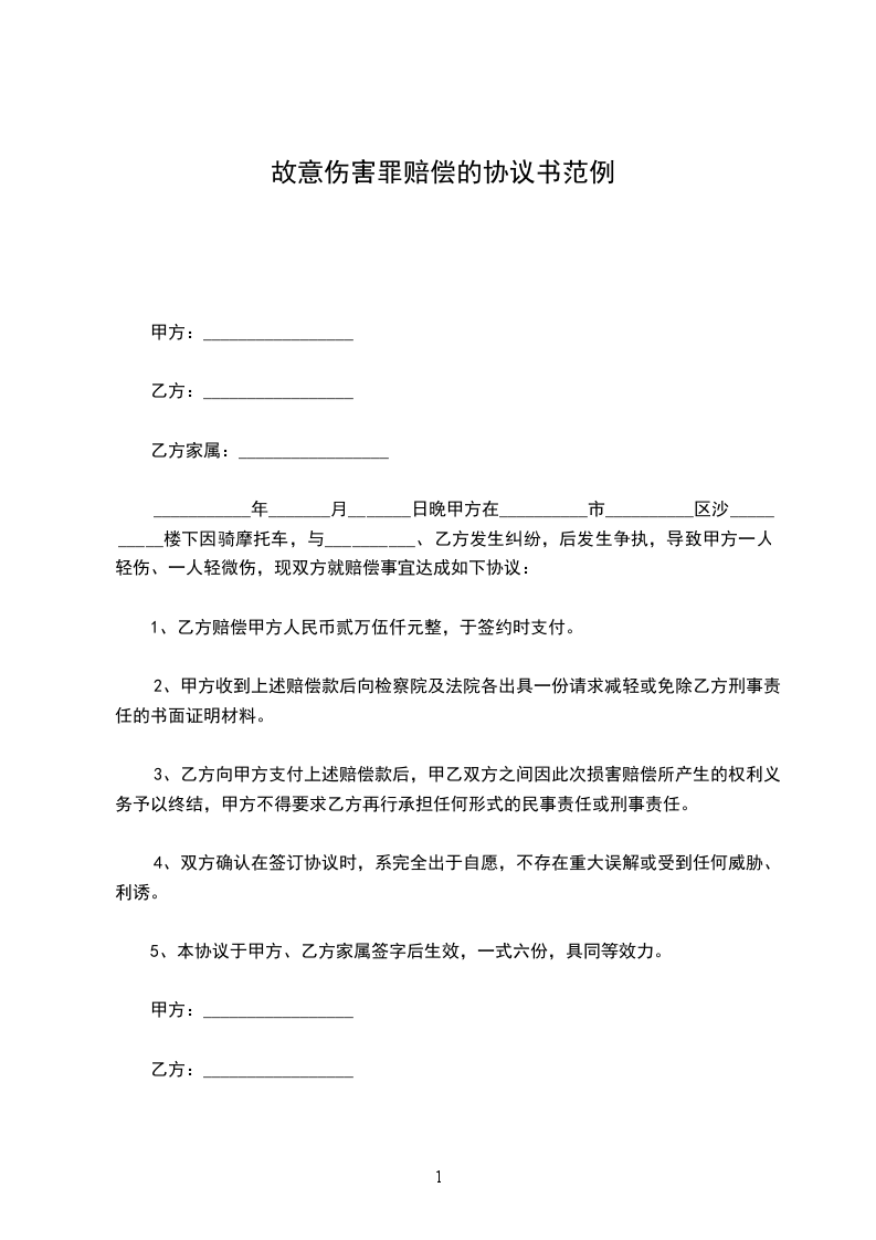 ___________年_______月_______日晚甲方在__________市__________区沙__________楼下因骑摩托车,与__________、乙方发生纠纷,后发生争执,导致甲方一人轻伤、一人轻微伤,现双方就赔偿事宜达成如下协议: