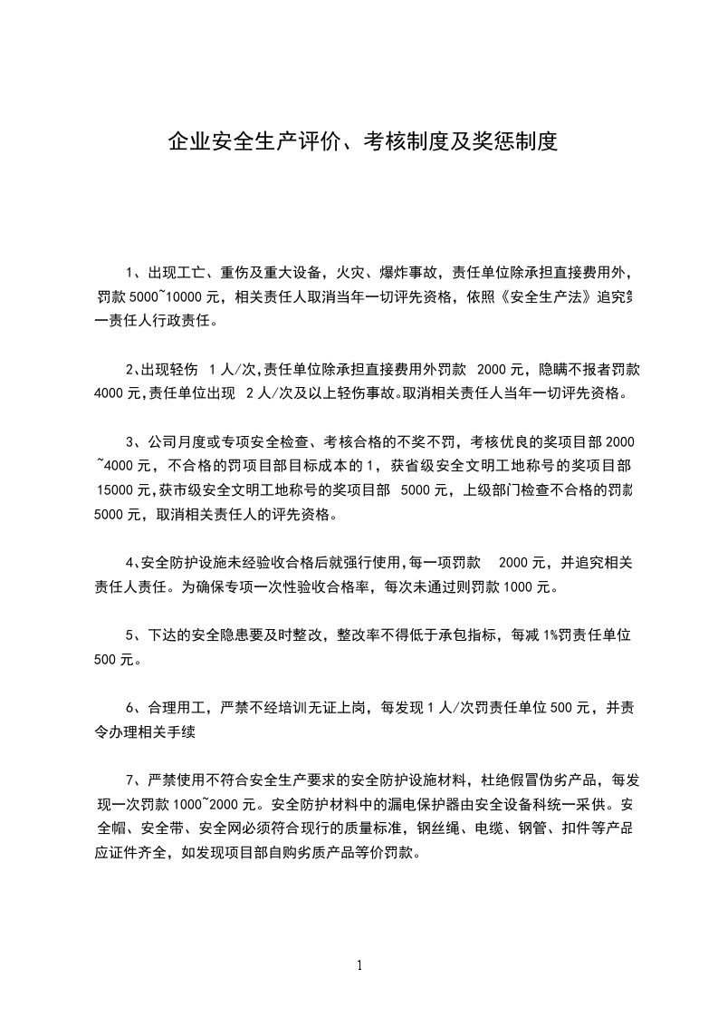 7、严禁使用不符合安全生产要求的安全防护设施材料,杜绝假冒伪劣产品,每发现一次罚款1000~2000元。安全防护材料中的漏电保护器由安全设备科统一采供。安全帽、安全带、安全网必须符合现行的质量标准,钢丝绳、电缆、钢管、扣件等产品应证件齐全,如发现项目部自购劣质产品等价罚款。