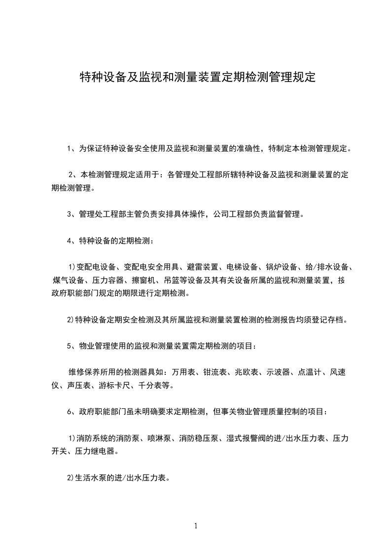 2、本检测管理规定适用于:各管理处工程部所辖特种设备及监视和测量装置的定期检测管理。