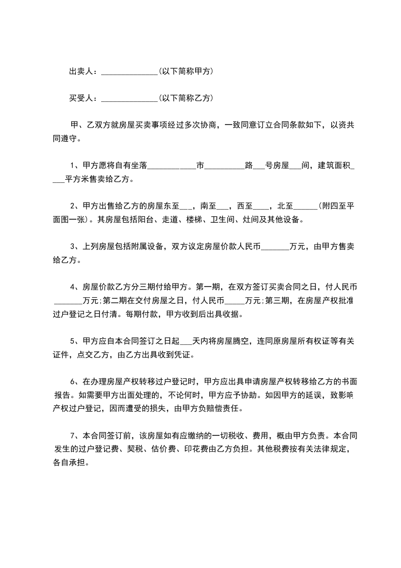 4、房屋价款乙方分三期付给甲方。第一期,在双方签订买卖合同之日,付人民币_______万元;第二期在交付房屋之日,付人民币_____万元;第三期,在房屋产权批准过户登记之日付清。每期付款,甲方收到后出具收据。