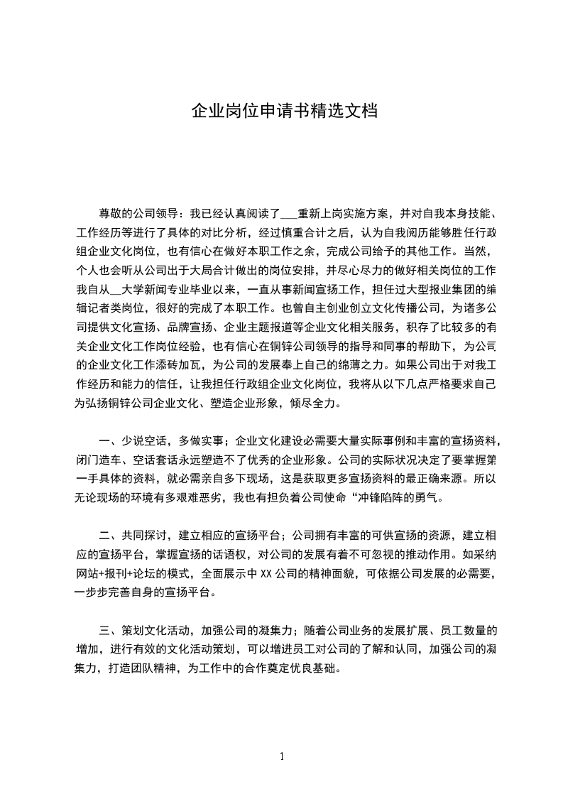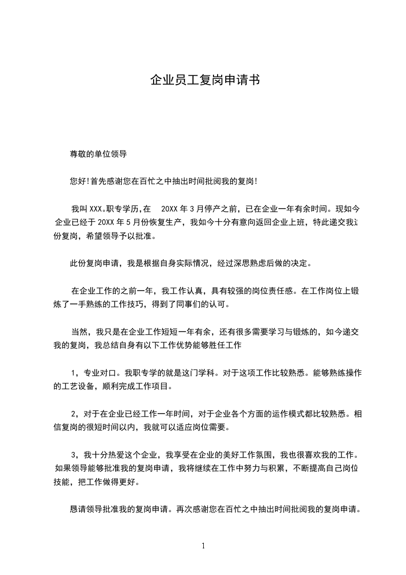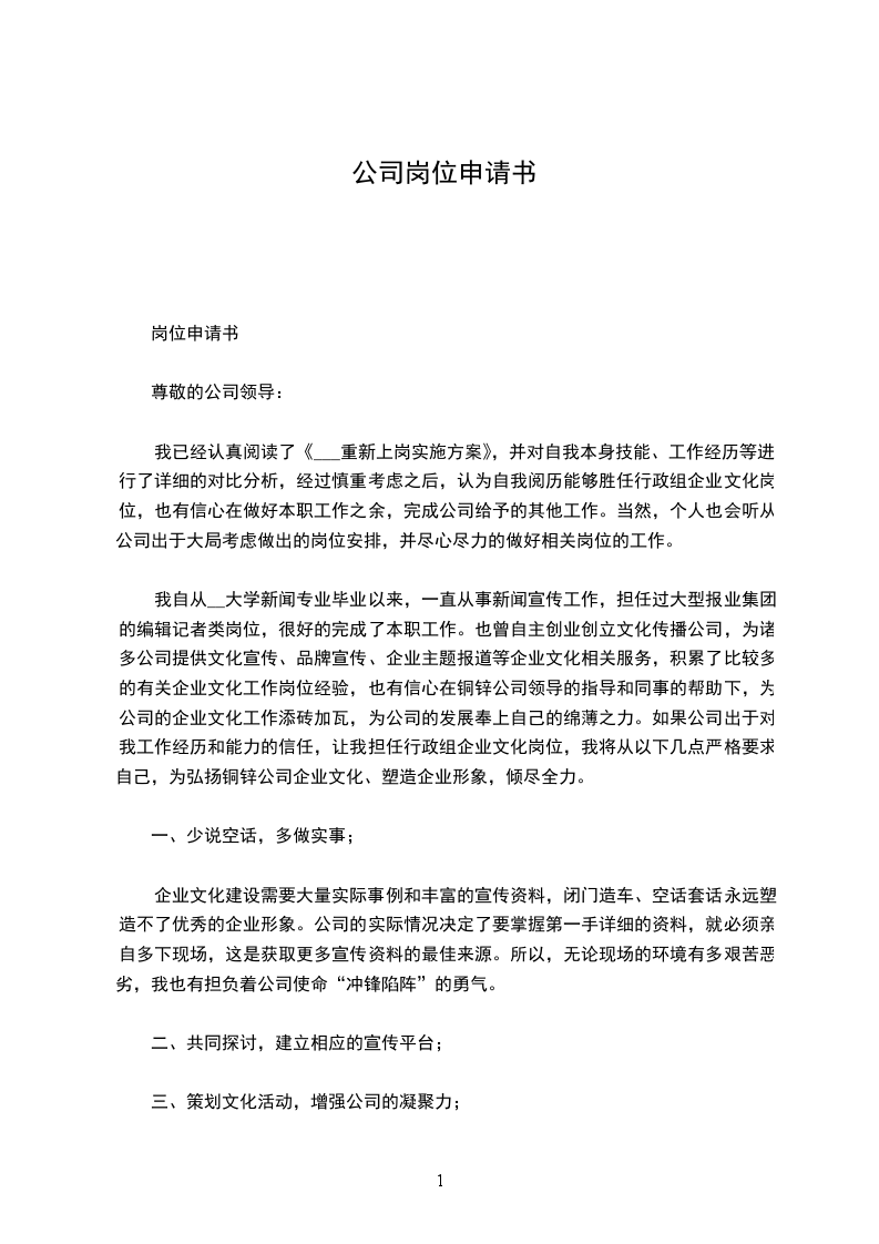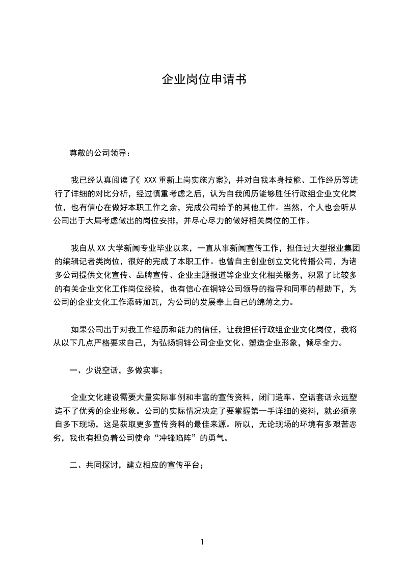 我已经认真阅读了《XXX重新上岗实施方案》,并对自我本身技能、工作经历等进行了详细的对比分析,经过慎重考虑之后,认为自我阅历能够胜任行政组企业文化岗位,也有信心在做好本职工作之余,完成公司给予的其他工作。当然,个人也会听从公司出于大局考虑做出的岗位安排,并尽心尽力的做好相关岗位的工作。