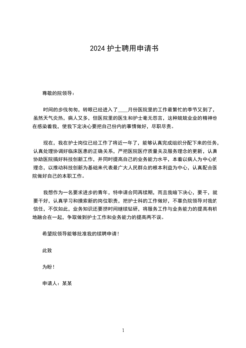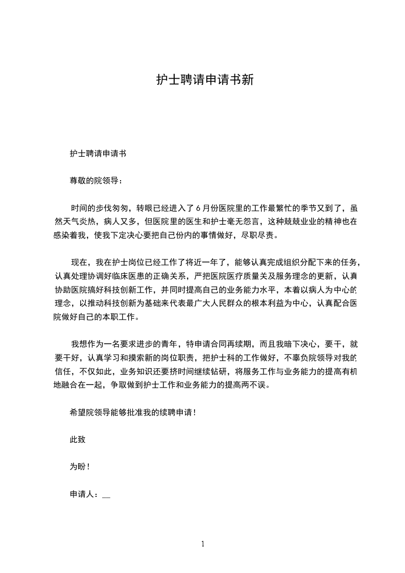 我想作为一名要求进步的青年,特申请合同再续期,而且我暗下决心,要干,就要干好,认真学习和摸索新的岗位职责,把护士科的工作做好,不辜负院领导对我的信任,不仅如此,业务知识还要挤时间继续钻研,将服务工作与业务能力的提高有机地融合在一起,争取做到护士工作和业务能力的提高两不误。