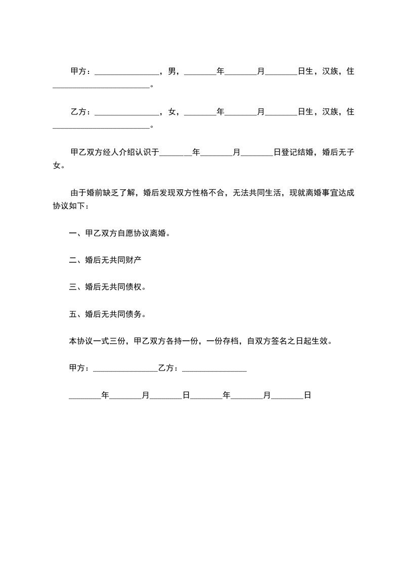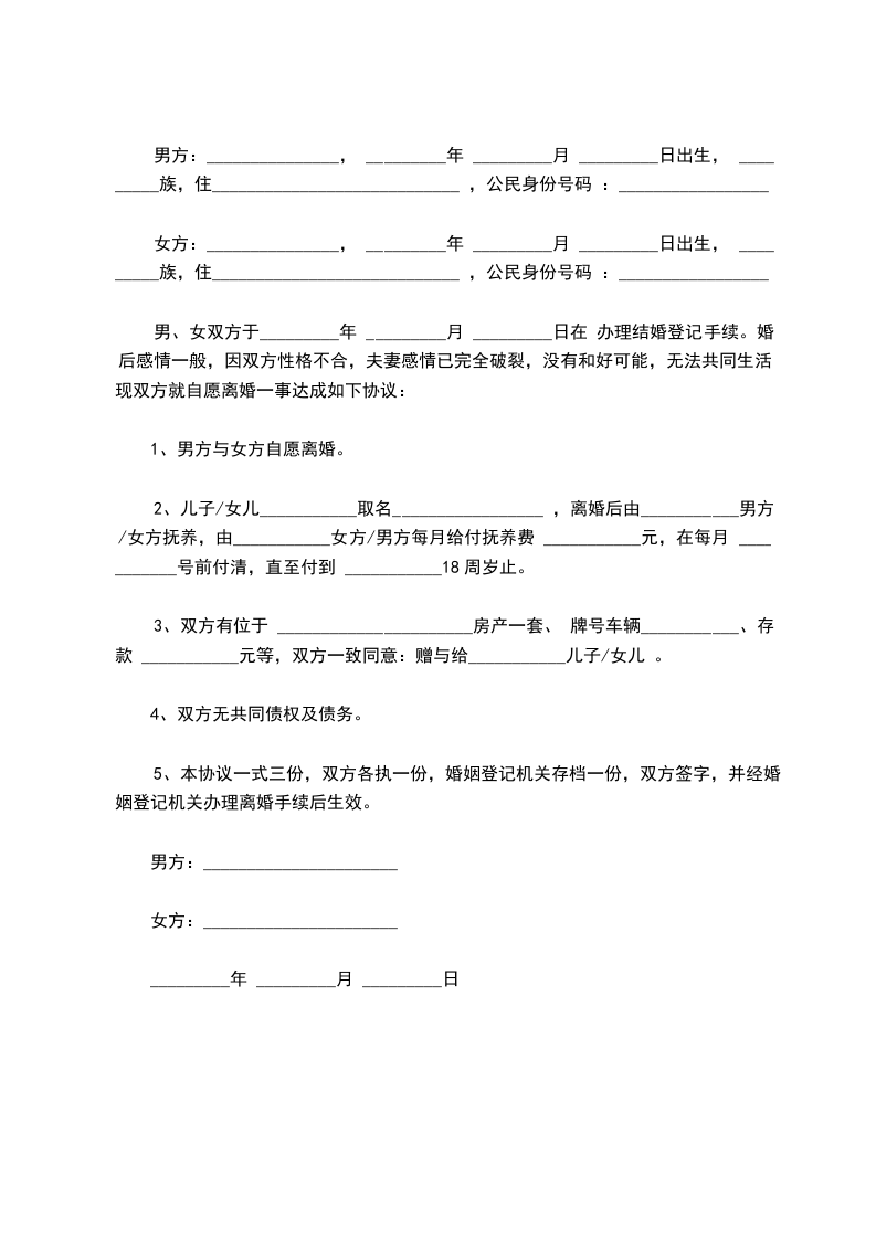 男、女双方于_________年 _________月 _________日在 办理结婚登记手续。婚后感情一般,因双方性格不合,夫妻感情已完全破裂,没有和好可能,无法共同生活。现双方就自愿离婚一事达成如下协议: