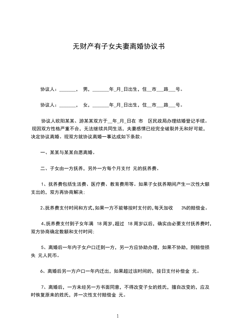 2、儿子/女儿___________取名_________________ ,离婚后由___________男方/女方抚养,由___________女方/男方每月给付抚养费 ___________元,在每月 ___________号前付清,直至付到 ___________18周岁止。