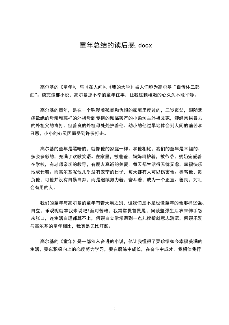 高尔基的童年是黑暗的,就像他的家庭一样。和他相比,我们的童年是幸福的,多姿多彩的,充满了欢歌笑语。在家里,被爸爸、妈妈呵护着,被爷爷、奶奶宠爱着;在学校,有老师亲切的教导,有朋友真诚的关爱。每天都生活得无忧无虑,幸福快乐地成长着。而高尔基呢他几乎没有安宁的日子,每天都有人可以伤害他、辱骂他、欺负他,可他并没有自暴自弃,而是继续努力着,奋斗着,成为一个正直、善良,对社会有用的人。
