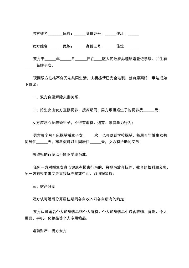 1、双方结婚之前的财产全部归各自所有,具体包括住房(位置_____________、房产证号_____________)、存款(金额_____________,银行_____________)、股权_____________(详细说明)以及其它财产_____________(应一一说明);