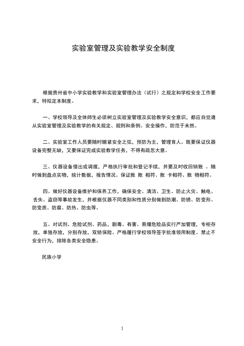 根据贵州省中小学实验教学和实验室管理办法(试行)之规定和学校安全工作要求,特拟定本制度。