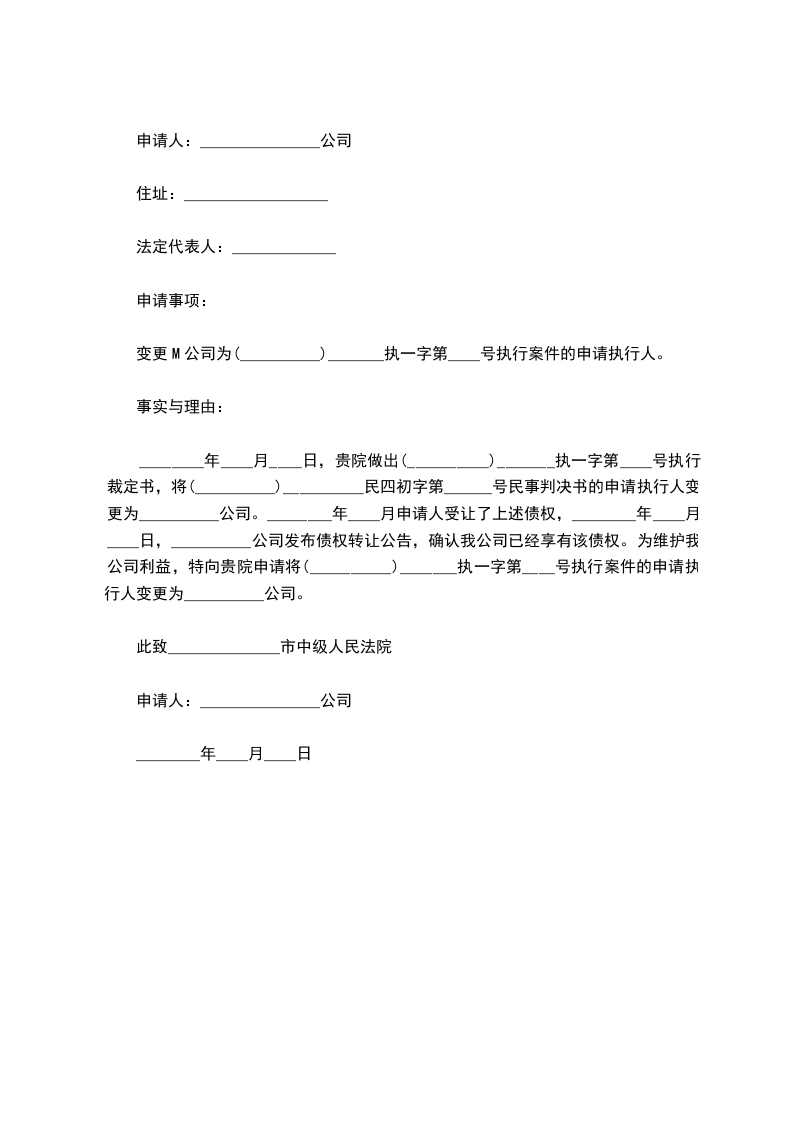 ________年____月____日,贵院做出(__________)_______执一字第____号执行裁定书,将(__________)__________民四初字第______号民事判决书的申请执行人变更为__________公司。________年____月申请人受让了上述债权,________年____月____日,__________公司发布债权转让公告,确认我公司已经享有该债权。为维护我公司利益,特向贵院申请将(__________)_______执一字第____号执行案件的申请执行人变更为__________公司。