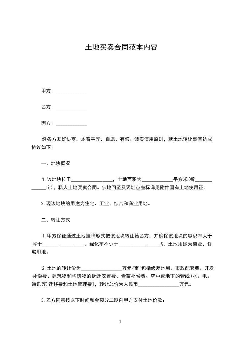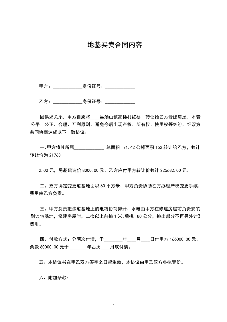 1.该地块位于_________________,土地面积为_____________平方米(折_____________亩),私人土地买卖合同。宗地四至及界址点座标详见附件国有土地使用证。