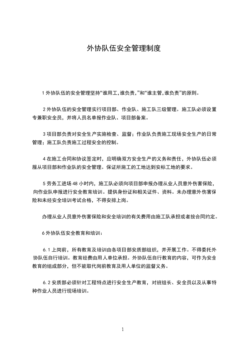 1.必须加强对民工、劳务队、外包工队的安全管理。对入场的工队,项目部要签订安全生产协议书,实行目标管理,责任落到实处。