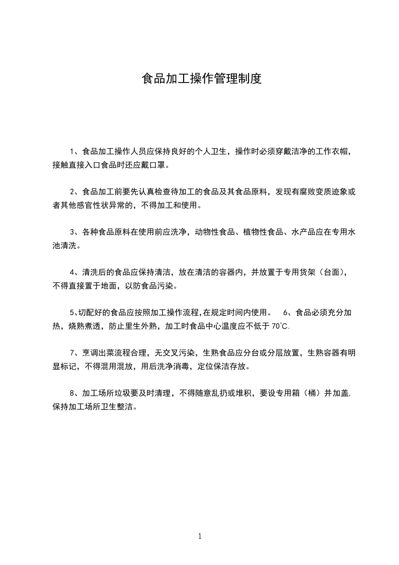 1、食品加工操作人员应保持良好的个人卫生,操作时必须穿戴洁净的工作衣帽,接触直接入口食品时还应戴口罩。